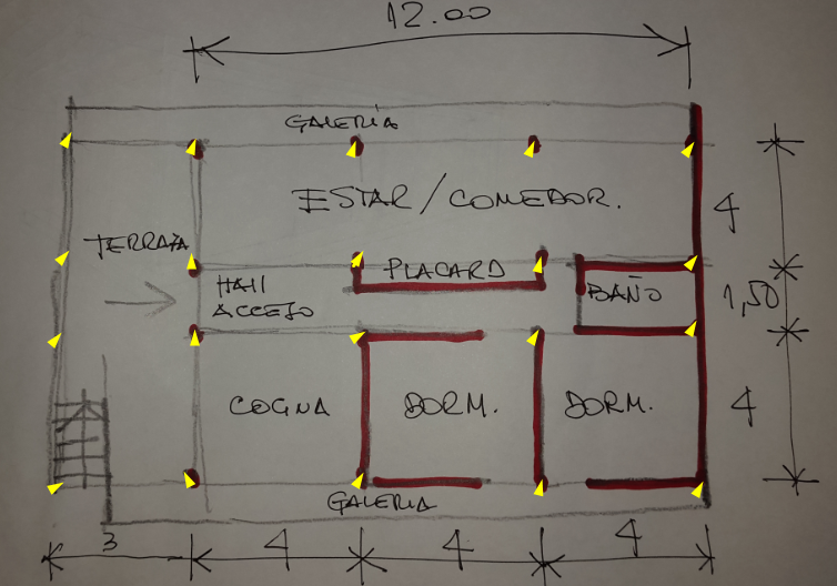 Tendrias que agregar al menos 2 filas mas de pilotines con su correspondiente perfil estructural, entre sendos centros de sectores: estar-comedor, y por otro lado cocina y dormitorios..