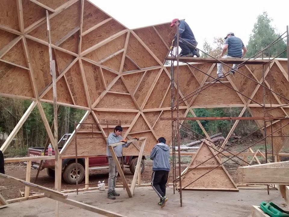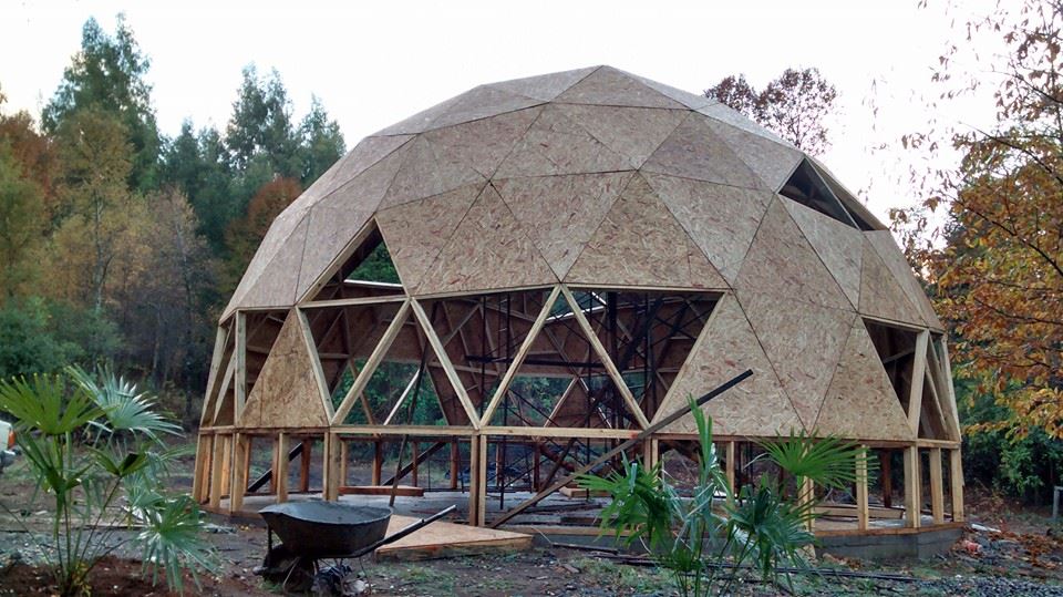 Hola, mi nombre es Anahi y soy nueva en el foro. Junto a mi pareja y a un grupo de gente estamos realizando nuestro primer domo geodésico como vivienda unifamiliar. El domo mide 11 mts de diámetro y esta construido con pino elliotis de 2*5". La cubierta es de OSB de 9 mm.