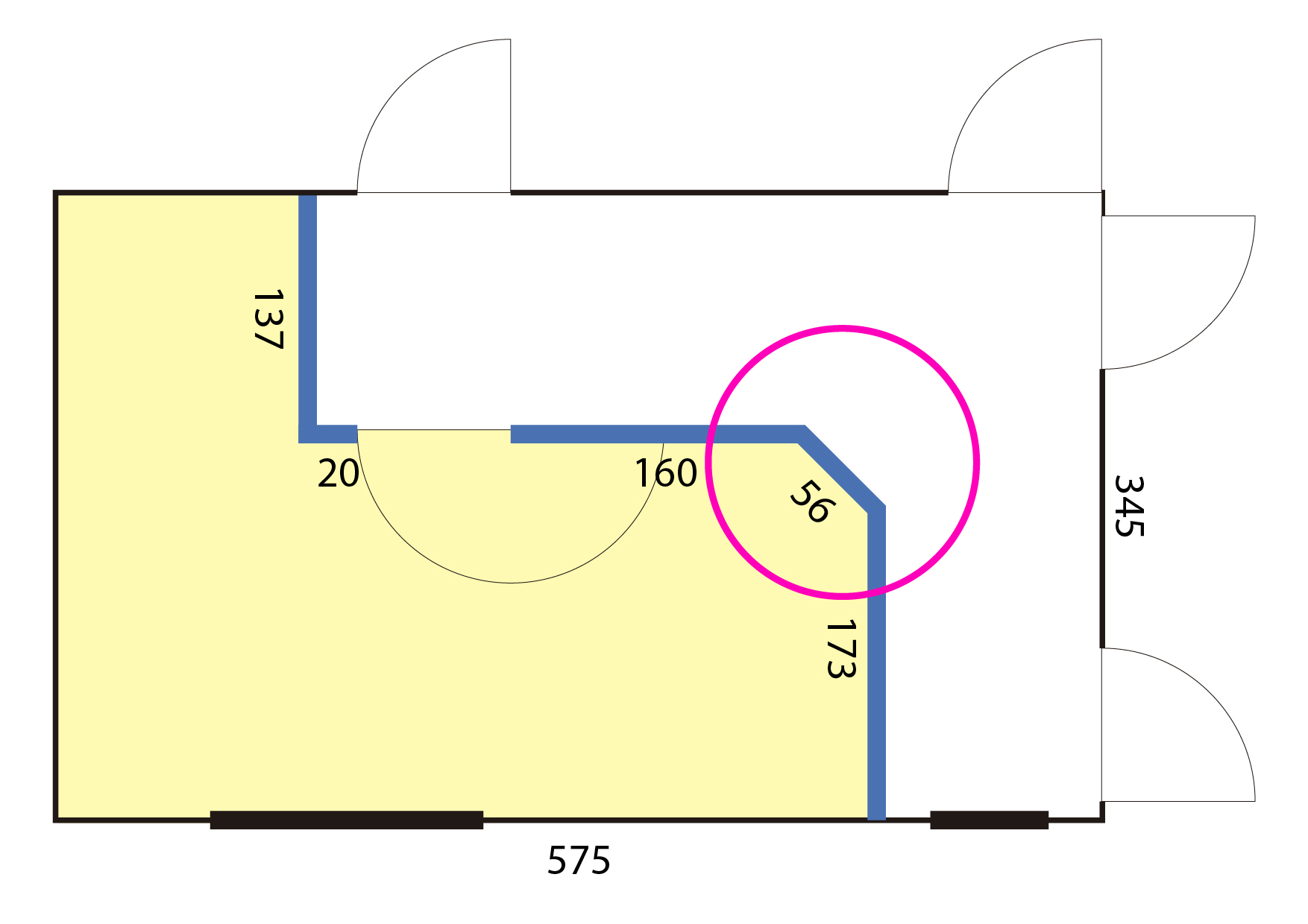 Adjunto una foto de la idea a realizar. El rectangulo general es el ambiente que dispongo (575x345cm), la linea AZUL seria pared divisoria a realizar (lleva una puerta) y por ende la zona color AMARILLO sería la pequeña habitación. Todas las medidas son estimativas y en centimetros.