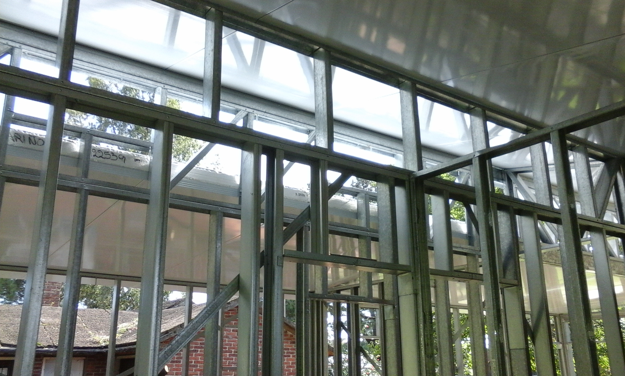 Lo que ven cada 60 cm en realidad no es el apoyo del techo, es una "tapa" digamos... no hace fuerza porque es parte del pasillo, por eso no tenia sentido meter tanto perfil, donde apoya el techo esta con reticulada. El tímpano pasa lo mismo, los paneles no hacen fuerza ahí.