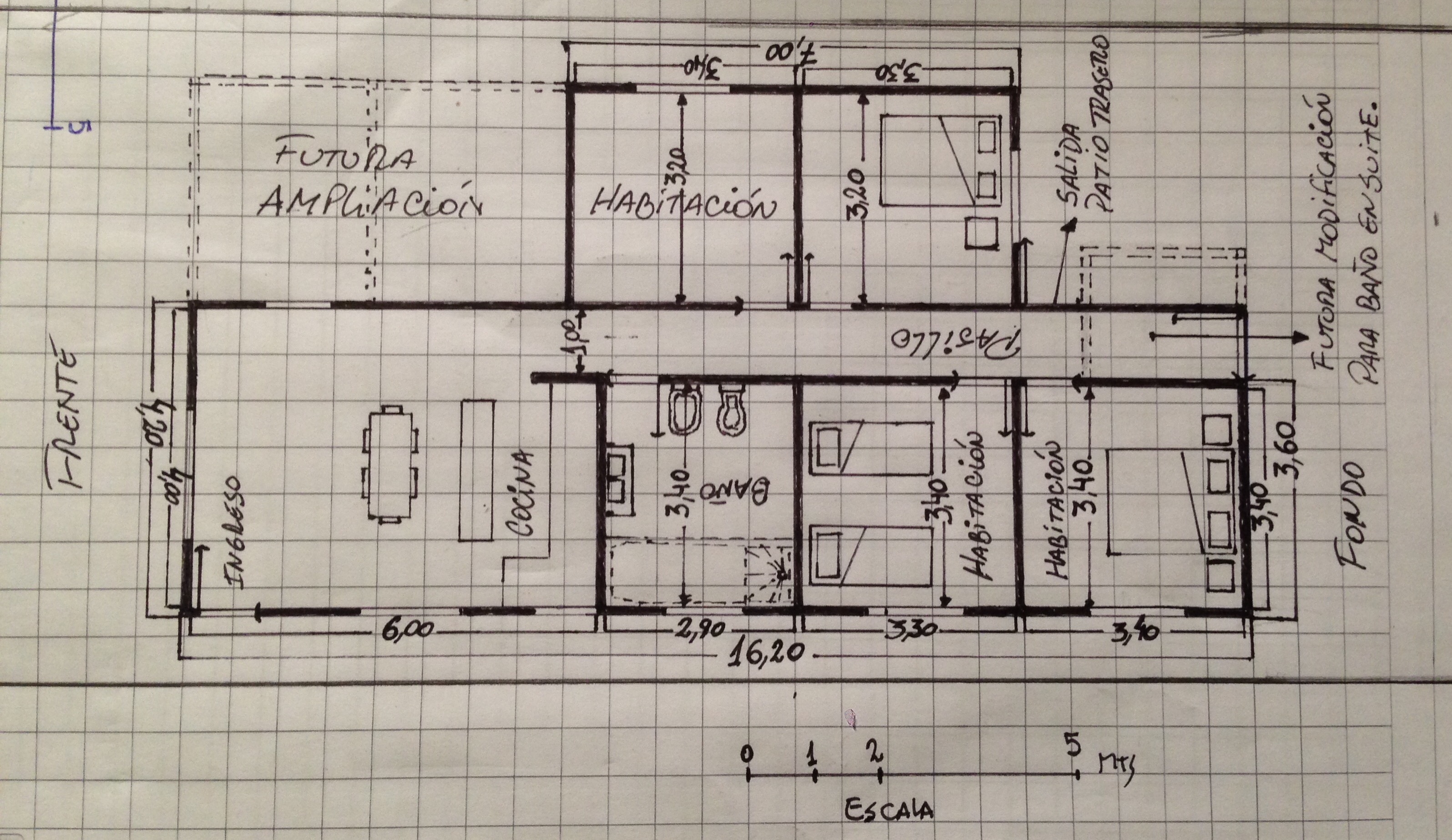 Bueno no me deja subir la foto con el primer plano donde están las medidas. Pero es de 16,20 mts de largo por 8mts en la parte más ancha. Lo que está marcado con rayitas discontinuas son las futuras ampliaciones. El frente de la casa está orientado hacia el sur. Trataré de ver cómo subo la otra imagen porq me dice que supera los 2mb de tamaño.
