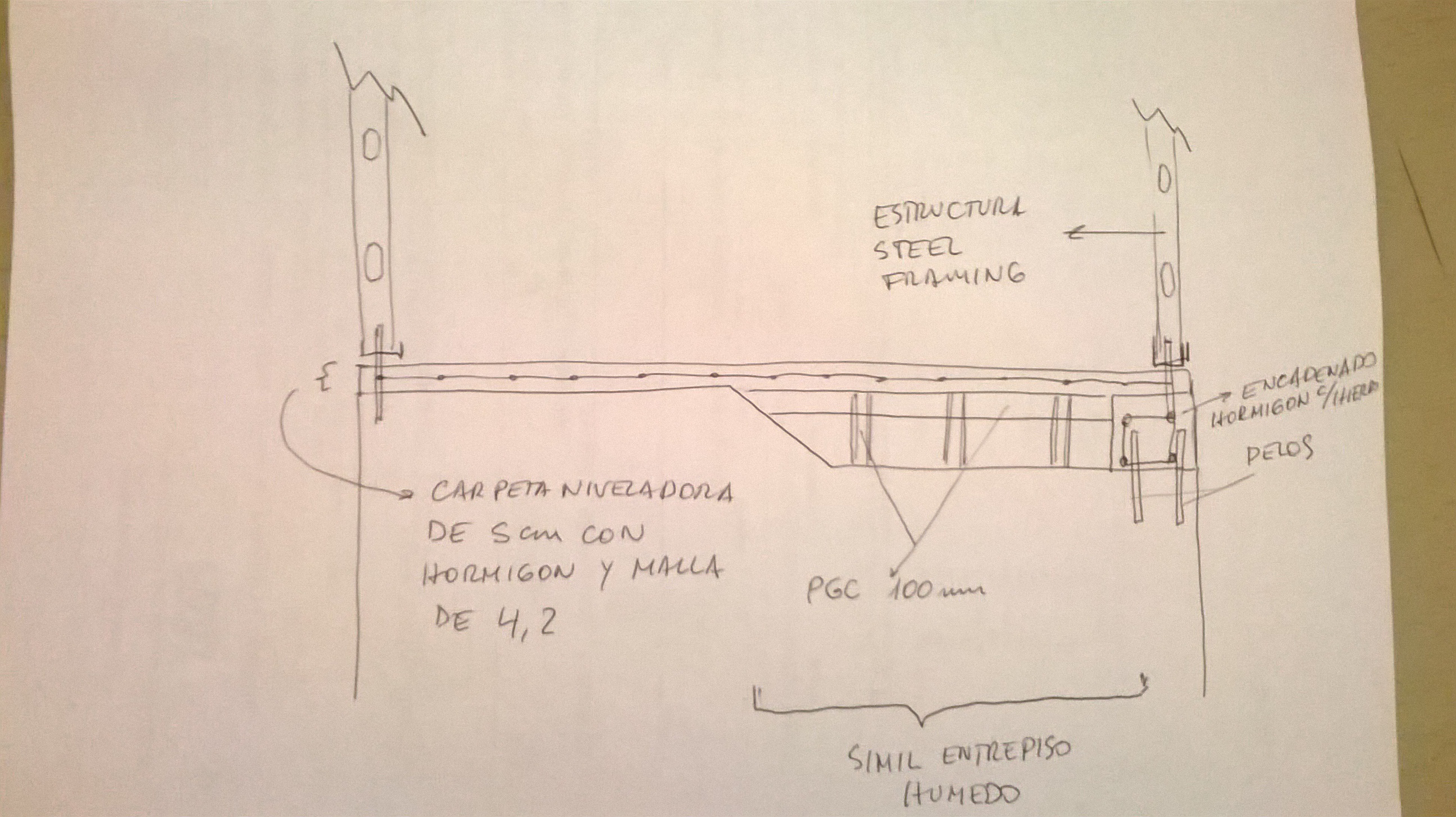El ambiente en cuestión (el que pretendo con steel) es de 10 x5; con el objeto de no crear peso sobre la vivienda de abajo la terminación seria así (sobre el panel de steel) OSB, barrera agua y viento, telgopor y base coat.