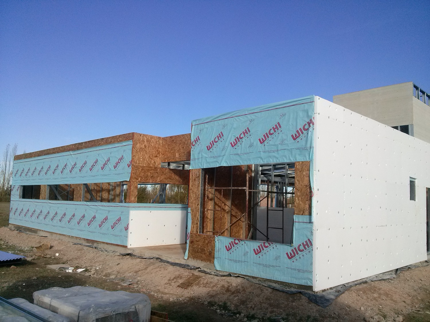 Aqui en esta foto se ve la Placa OSB que es la primera en colocarse sobre la perfileria de Steel Framing y tambien se ve (colocado parcialmente) la barrera repelente al agua (tambien llamada wichi o tyvek) y alguna plancha de EPS (de 50mm en este caso]